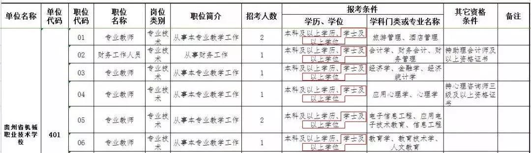 比如,下图为贵州省机械职业技术学院招聘教师公告(部分),报考条件要求求职者必须有学位证书。